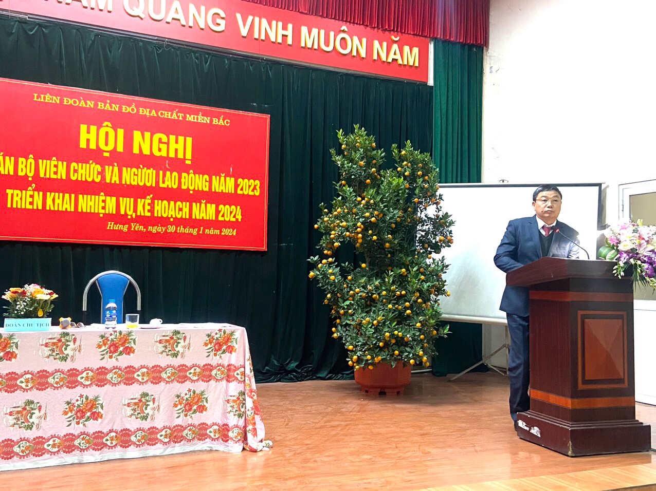 Ngày 30/01/2024, Liên đoàn Bản đồ địa chất miền Bắc tổ chức Hội nghị cán bộ viên chức năm 2023 và triển khai nhiệm vụ, kế hoạch năm 2024 tại trụ sở Tân Quang, Văn Lâm, Hưng Yên. Tham dự Hội nghị có: